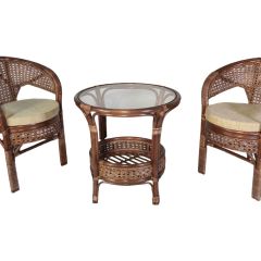 Комплект мебели Пеланги 02/15 включает в себя: 2 кресла и столик с красивым плетением снизу и полочкой, съемные подушки из материала улучшенного качества.
